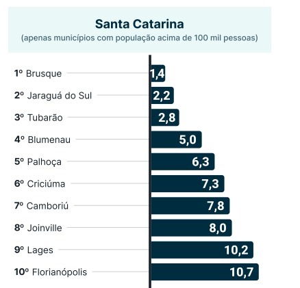 O município possui índice de 5,0. Ele é seguido por Indaiatuba/SP (5,7) e Araraquara/SP (6,0). Em quarto lugar aparece Palhoça com índice de 6,3 assassinatos para cada 100 mil habitantes.