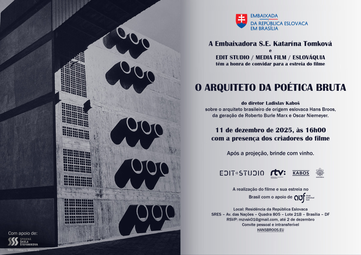 A equipe eslovaca do documentário “Architekt Drsnej Poetiky” (“Arquiteto da Poética Bruta”), sobre a vida e obra do arquiteto Hans Broos, e a Embaixada da Eslováquia no Brasil convidaram-nos para prestigiar as duas únicas apresentações no Brasil, que ocorrerão na capital brasileira, Brasília.