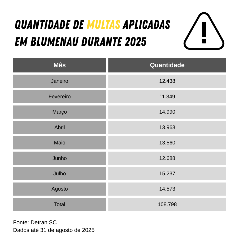 Das mais de 108 mil multas aplicadas em Blumenau nesses oito meses do ano, julho registrou o maior número, com 15,2 mil notificações; seguido por março, com 14,9 mil e agosto, com 14,5 mil autos de infração.