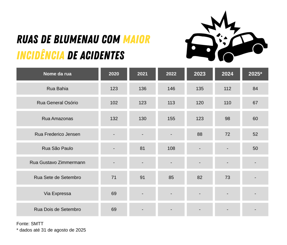 Os números também mostram que a rua Bahia é uma das principais vias com maior incidência de acidentes, sendo registrados 84 apenas neste ano. Contudo, em anos anteriores, a rua já chegou a contabilizar 136 acidentes em 2021 e 135 em 2023. Na sequência do ranking estão as ruas General Osório e Amazonas, com 67 e 60 casos de acidentes apenas neste ano, respectivamente.