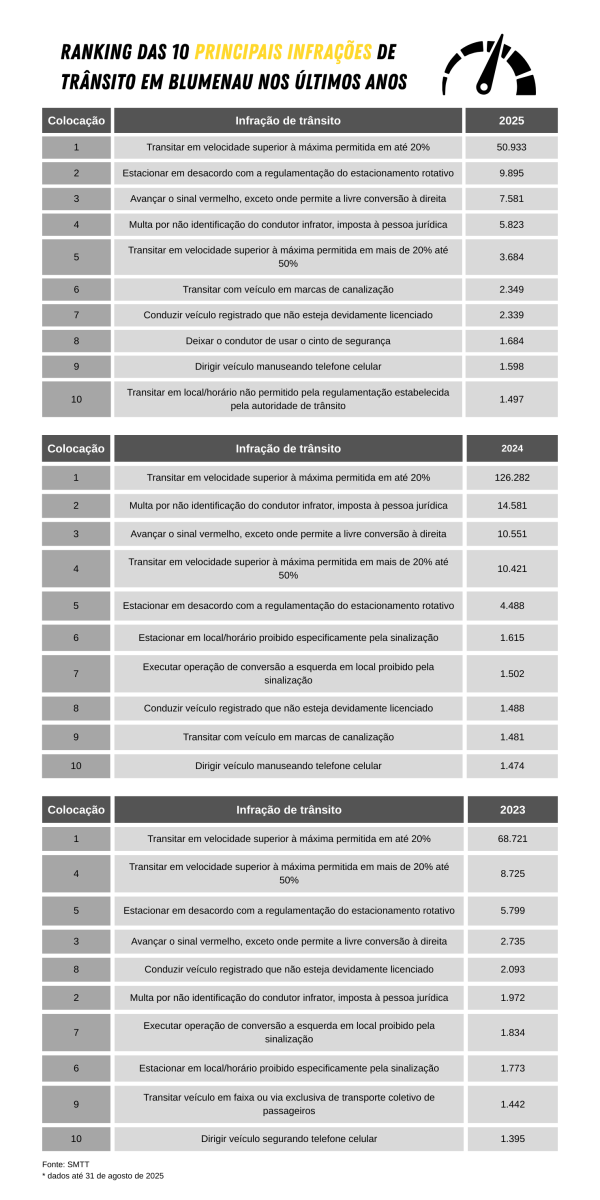 O levantamento, realizado pela Secretaria Municipal de Trânsito e Transportes (SMTT) a pedido da reportagem do jornal O Município Blumenau, mostra o ranking das dez principais infrações de trânsito no município. Os dados de 2025 apontam que, com 50,9 mil casos, transitar em velocidade superior à máxima permitida em até 20% é a principal violação, cuja gravidade é média, mas rende quatro pontos na Carteira Nacional de Habilitação (CNH).