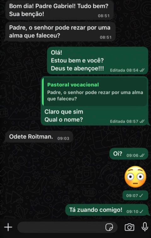 “Hoje recebi um pedido de oração bem inusitado. Uma paroquiana mandou bem assim: o senhor pode rezar por uma alma, por uma pessoa que faleceu? Eu falei “Claro. Qual o nome?”. Ela mandou: Odete Roitman”, conta.